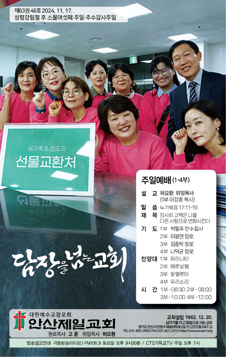 | 20241124 주일, 안산제일교회 주보 및 예배 시간 안내 (0) | 2024.11.24 |