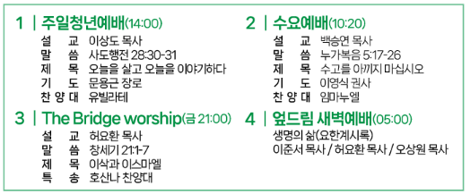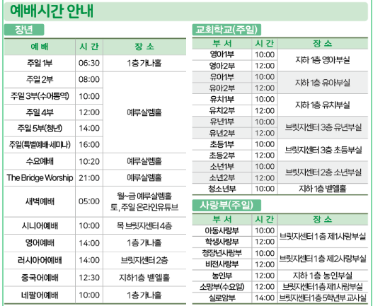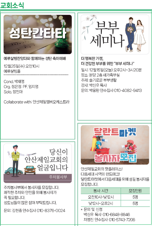 | 20241222 주일, 안산제일교회 주보 및 예배 시간 안내 (0) | 2024.12.21 |